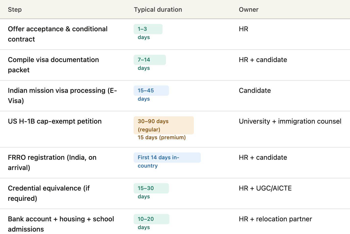 In India, international hires typically come on an Employment Visa (E-Visa). The position must pay a minimum of USD 25,000 per year (roughly ₹20.8L at current rates) — this is a hard floor, not a guideline. For US hires, an H-1B cap-exempt status applies to institutions of higher education, meaning universities can file H-1B petitions year-round without the lottery. An O-1 is available for faculty of “extraordinary ability” and is faster but stricter on evidence. Confirm which visa class fits before the role is posted.