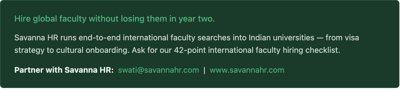 “The best international hires we have made were not the ones with the strongest CVs. They were the ones where our onboarding made them feel expected, not tolerated. That difference is the entire game.” — Pro-VC, research-intensive Indian university