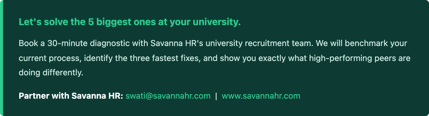 4. Weak employer brand. Many universities have no dedicated careers site, no faculty testimonials, no research visibility. Solution: treat your careers page like a product — faculty stories, research outputs, clear comp bands.